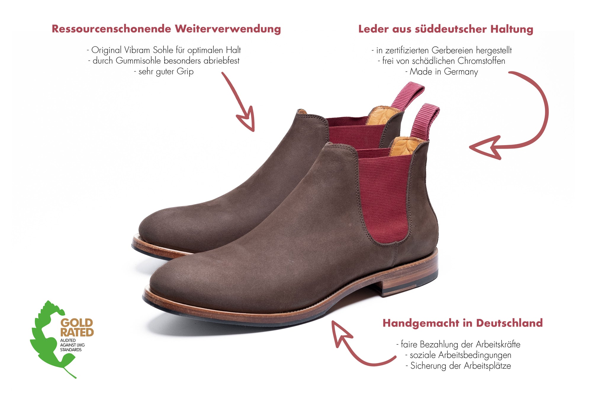 Als Oberleder und Innenfutter, wird ausschließlich Leder aus zertifizierten deutschen Gerbereien verwendet. Hierbei setzen wir auf eine Ledersohle, welche zusätzlich mit einer Gummisohle versehen ist. Die dünne Gummisohle sorgt für einen guten Grip, ohne lästiges rutschen an nassen Tagen. Besonders wichtig war uns, dass der Schuh einfach repariert werden kann, um die Langlebigkeit bei entsprechender Pflege zu erhöhen.