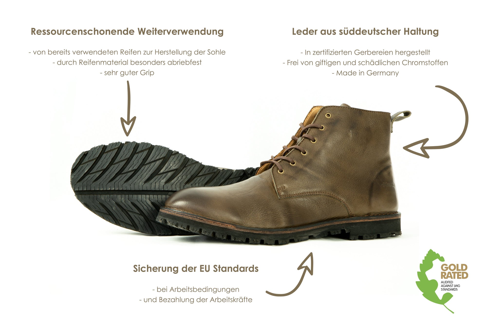 Handwerklich in Portugal hergestellt, zeichnet sich dieser Boot durch seine Leichtigkeit aus. Als Oberleder und Innenfutter, wird vegetabil gegerbtes Leder aus zertifizierten deutschen Gerbereien verwendet. Natürlich ist auch dieses Mal unsere langhaltende Reifensohle die Basis für einen stabilen Schritt. Besonders wichtig ist uns, dass der Schuh einfach repariert werden kann, um die Langlebigkeit bei entsprechender Nutzung zu garantieren.